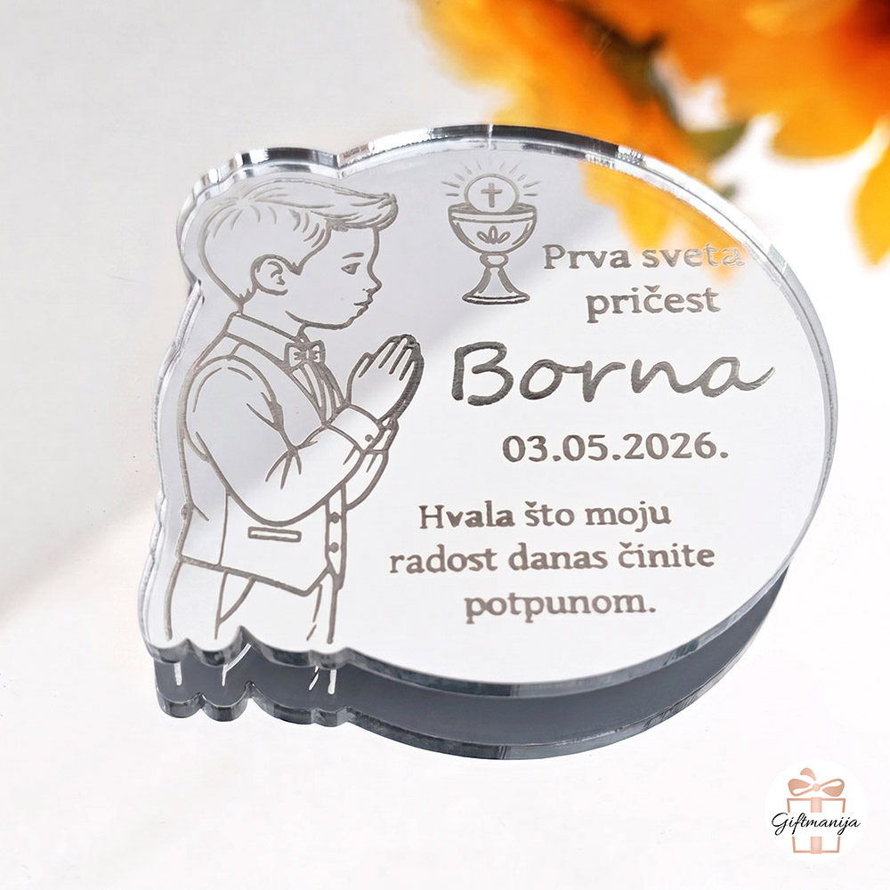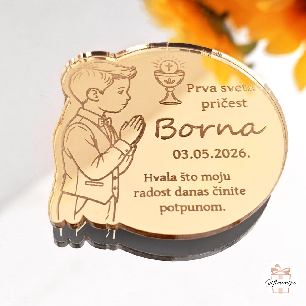 Tehnologija laserskog graviranja omogućuje nam da na svaku akrilnu okruglu pločicu ugraviramo nježan motiv dječaka sklopljenih ruku u molitvi. Uz ovaj dirljivi vizual, svaka se zahvalnica u potpunosti personalizira prema vašim specifičnim željama – dodajemo ime vašeg dječaka, točan datum održavanja svete pričesti te toplu poruku zahvale iz dubine srca, prilagođenu vašoj obitelji. Snažan i pouzdan magnet pažljivo apliciran na poleđini osigurava da će vaši gosti ovu dragocjenu uspomenu lako postaviti na svoj hladnjak ili bilo koju drugu metalnu površinu, gdje će svakodnevno blistati i mamiti osmijehe. U našem Giftmanija web shopu ponosimo se vrhunskom kvalitetom izrade i brzom isporukom, kako bi vaš poseban dan prošao potpuno bezbrižno.