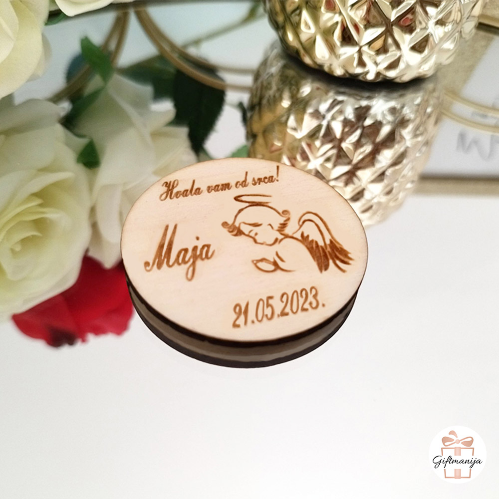 Okrugli, elegantan dizajn: Za razliku od naših ostalih drvenih zahvalnica s klasičnim izrezanim oblicima anđela, ovaj specifični okrugli drveni magnet za krštenje i pričest pruža jedinstvenu i vrlo modernu siluetu. Unutar kruga nalazi se predivan motiv anđela obogaćen vašom personaliziranom porukom.