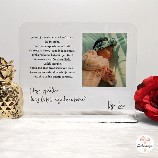 Naš personalizirani akrilni stalak sa slikom i posvetom savršen je izbor ako želiš poseban način da pitaš svoju buduću kumu pitanje koje će pamtiti cijeli život – „Hoćeš li biti moja krsna kuma?“