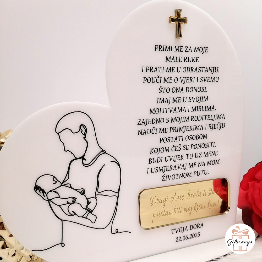 Tražite savršen poklon za krsnog kuma? Krštenje je jedinstven događaj, a odabir pravog poklona koji će izraziti zahvalnost i ostati trajna uspomena može biti izazov. Upravo zato smo osmislili ovaj personalizirani poklon koji na elegantan način čuva sjećanje na taj sveti dan. Ovo nije samo ukras; ovo je emotivna uspomena i savršen poklon za krsnog kuma koji će s ponosom istaknuti u svom domu ili uredu.