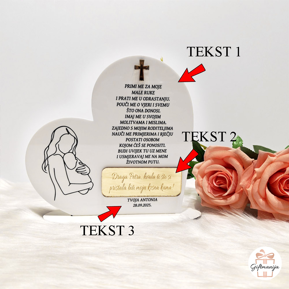 - Tekst 2 (Posveta kumi): Ovo je srce poklona – vaša osobna posveta kumi na zlatnoj pločici, mjesto gdje mu možete zahvaliti na prihvaćanju ove važne dužnosti.
