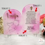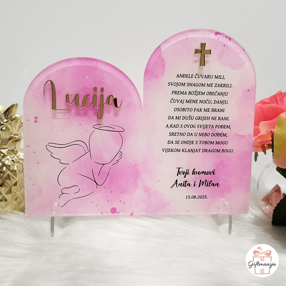 Ono što ovaj proizvod čini zaista neprocjenjivim i posebnim je visoka razina personalizacije. Na glatkom rozom akrilu posebno se ističe ime djeteta, koje je precizno izrezano od sjajnog, zrcalnog zlatnog akrila, stvarajući predivan 3D efekt koji privlači poglede. Uz ime, upisana je i svima draga dječja molitva “Anđele čuvaru mili”. Na samom dnu stalka pažljivo printamo datum krštenja te imena kumova, teta, stričeva ili drugih osoba koje poklanjaju ovu dragocjenu uspomenu. Tako se stvara jedinstvena priča koja ostaje zabilježena u vremenu.